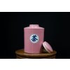 Keramická dóza ve snové růžové glazuře s kaligrafickým znakem pro čaj (茶). Stylový a funkční doplněk pro každého milovníka čaje.