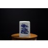 Šestihranná porcelánová dóza s jemnou kobaltově modrou krajinomalbou ve stylu dynastie Qing – připomínající malířství „básní a obrazů“.
