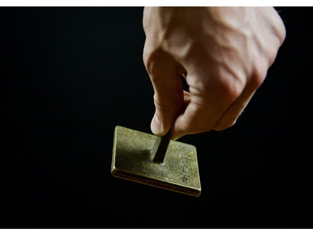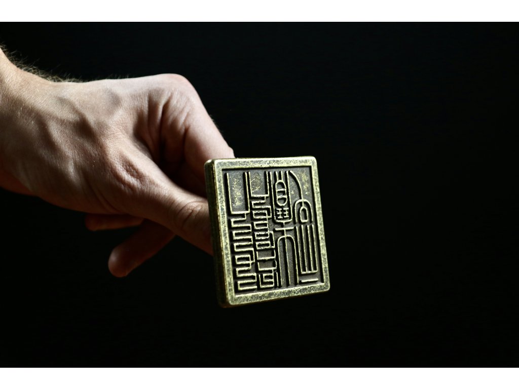 Pečeť je vyrobena z kvalitního bronzu a zachovává formu císařských pečetí užívaných u dvora – plochá čtvercová základna, výrazné držadlo a nápis v pečetním písmu (zhuan shu 篆书). Tento typ kaligrafie se používal výhradně pro oficiální pečetě vysokých hodnostářů a vladařů.