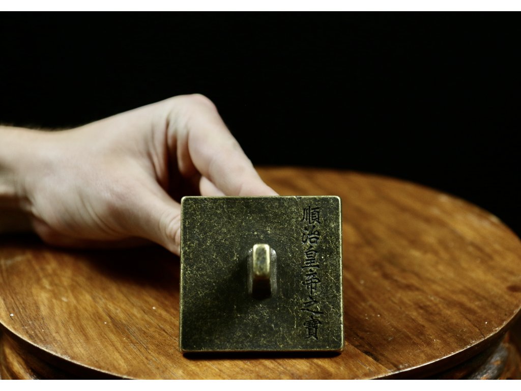 Tato bronzová pečeť nese nápis „順治皇帝之寶“ – Pečeť císaře Shunzhi, odkazující na prvního císaře dynastie Qing (vládl 1644–1661). Její zjednodušený, avšak elegantní design ctí tradiční čínské hodnoty harmonie a rovnováhy.