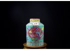 Luxusní porcelánová dóza s motivem tance císařských draků. Bohatá tyrkysová glazura a precizní malba činí z této nádoby skutečný sběratelský skvost.